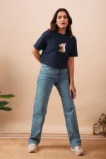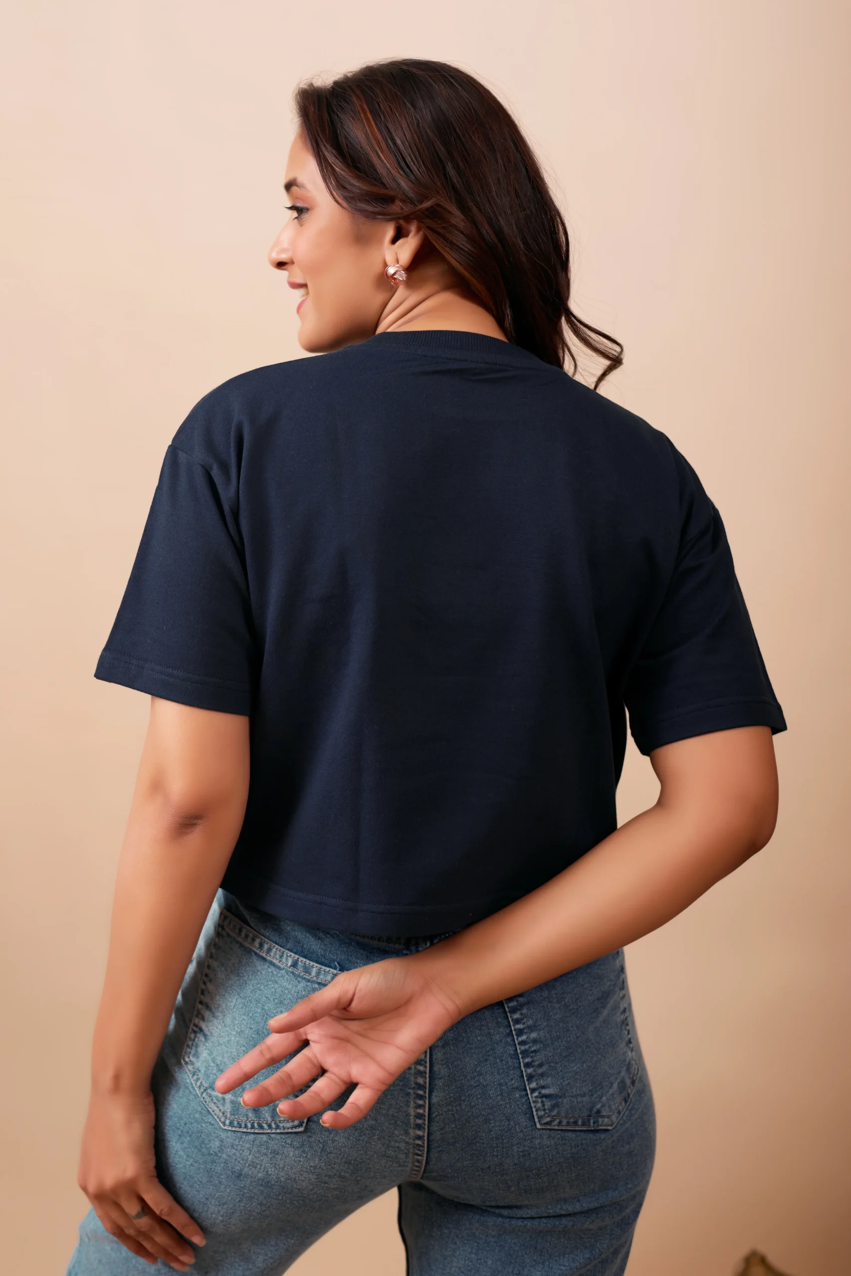 The deep navy base makes the pastel embroidery pop, creating a tee that’s as versatile as it is eye-catching.