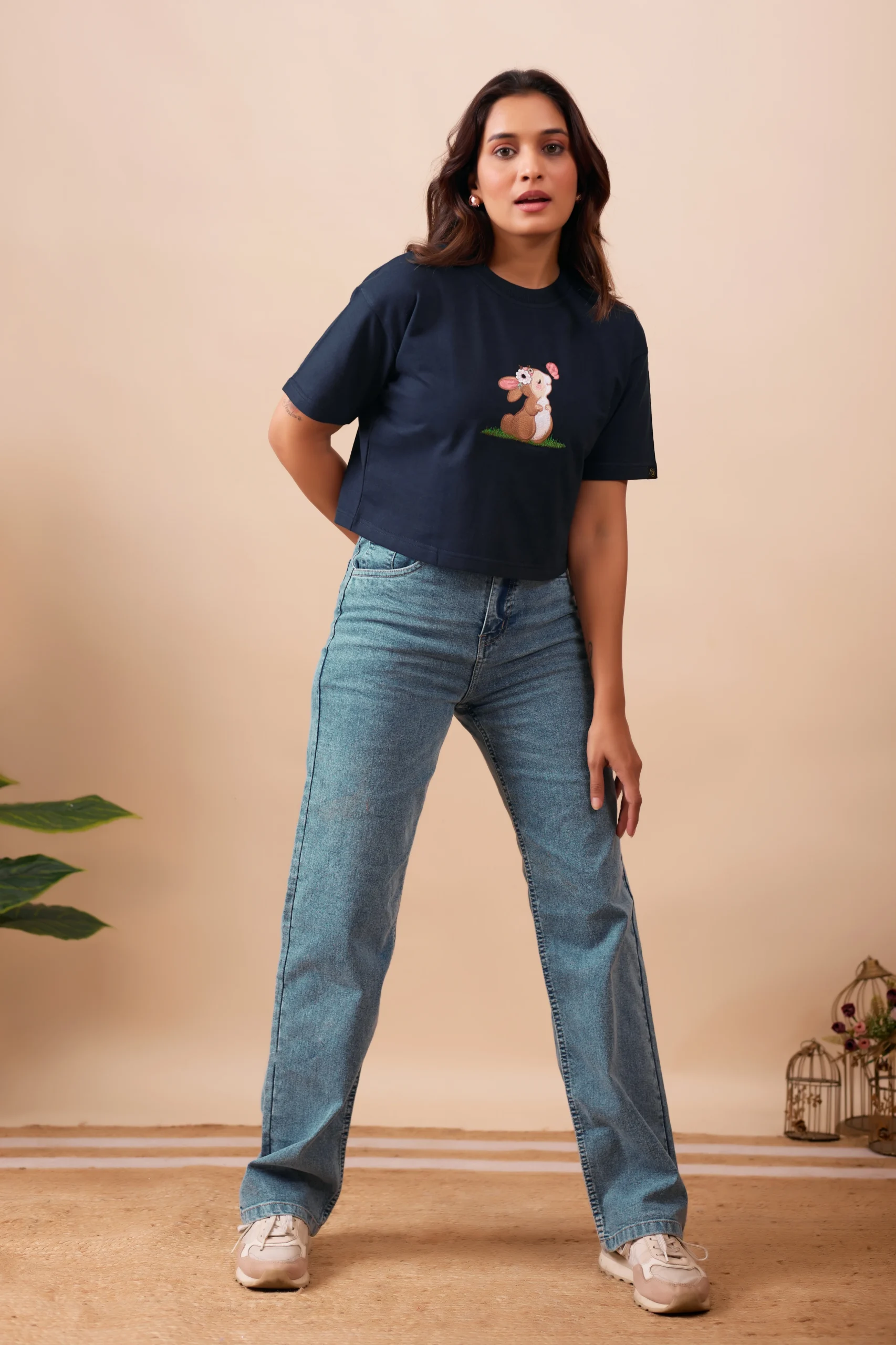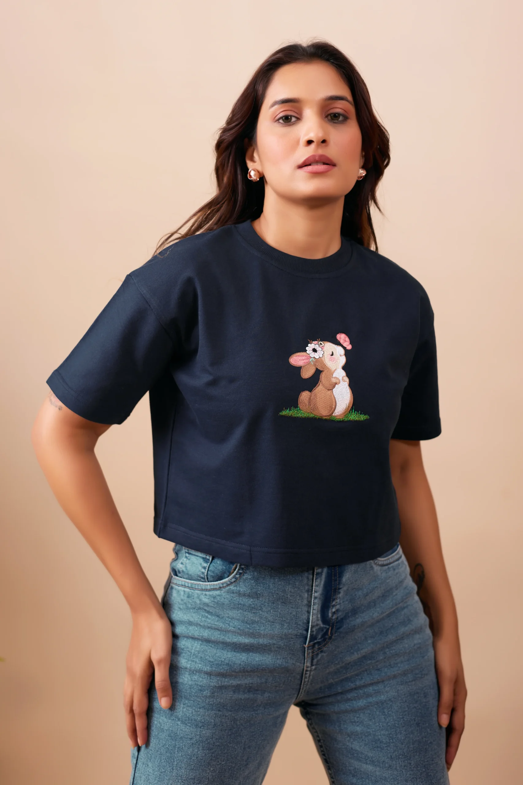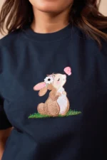The Blossom Bunny Oversized Tee combines cuteness with premium comfort. With a beautifully embroidered bunny sitting on green grass and looking at a pink butterfly, this design captures innocence and joy in a wearable form.