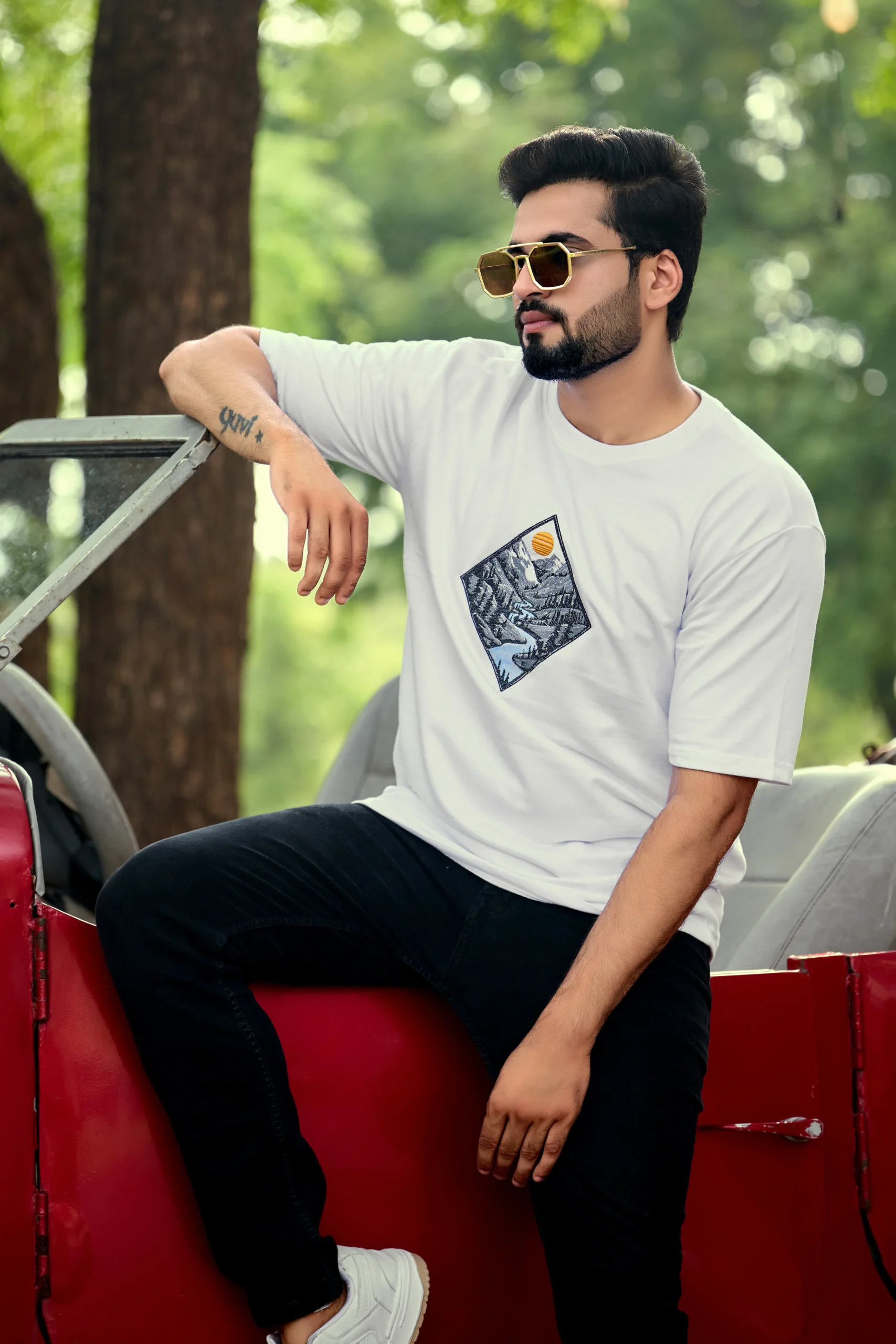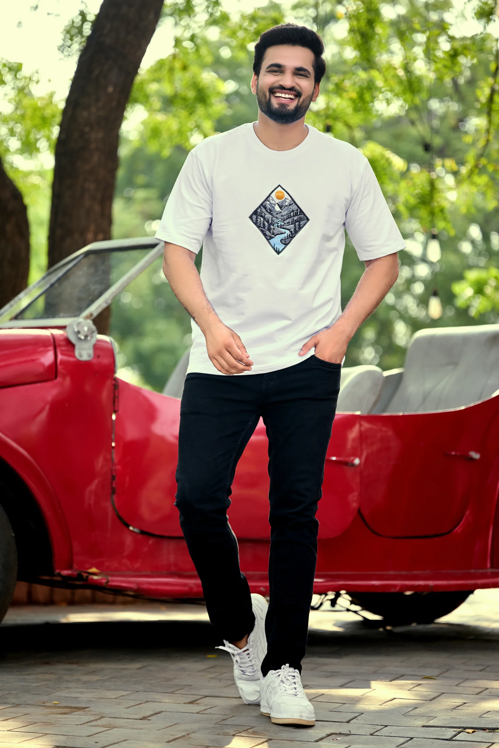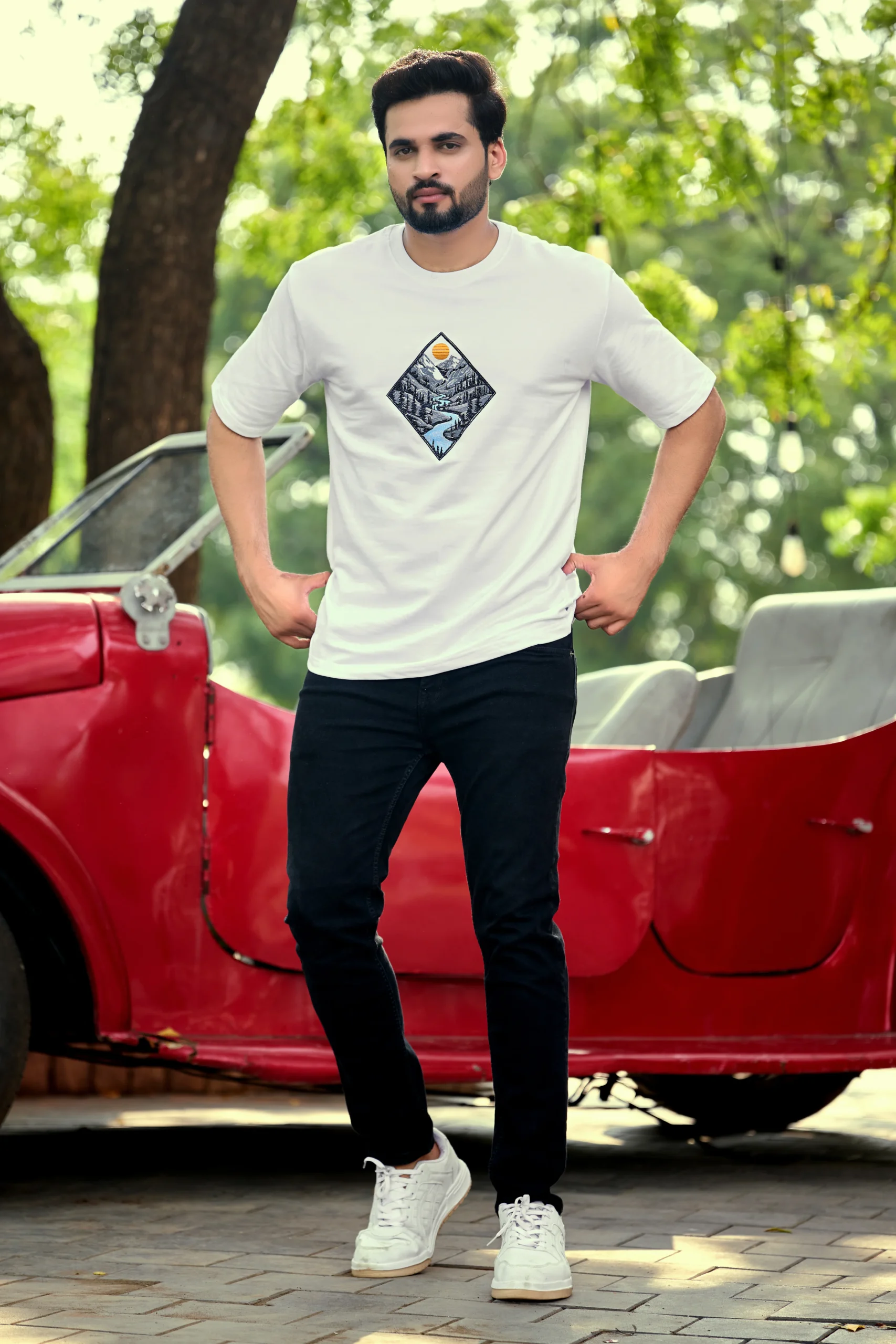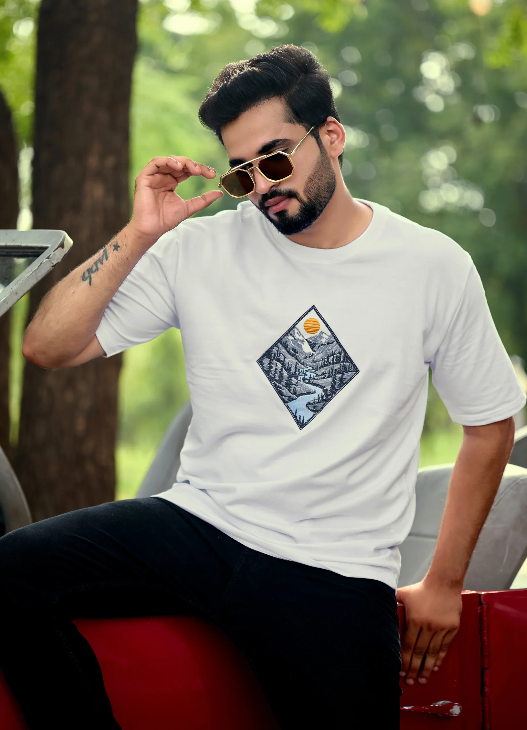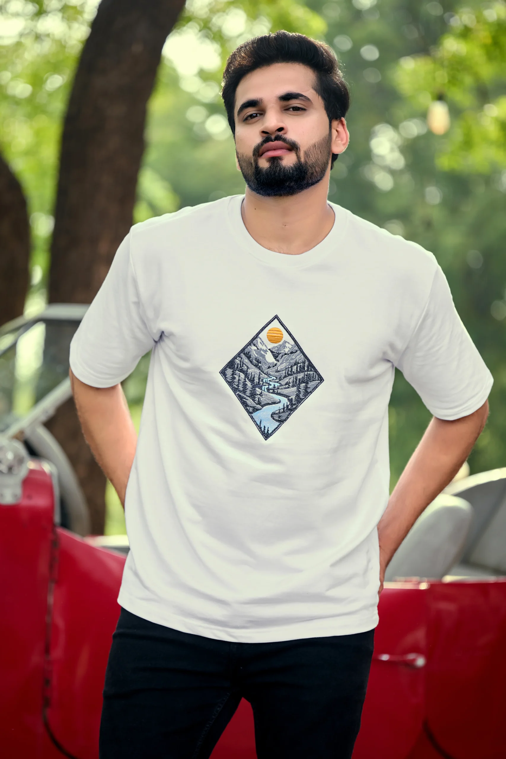 The Everest Escape Oversized Tee brings together premium quality and outdoor-inspired design. Featuring a scenic diamond-shaped print of mountains, pine forests, and a flowing river beneath a glowing sun, this tee captures the spirit of freedom and adventure.