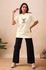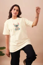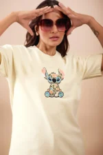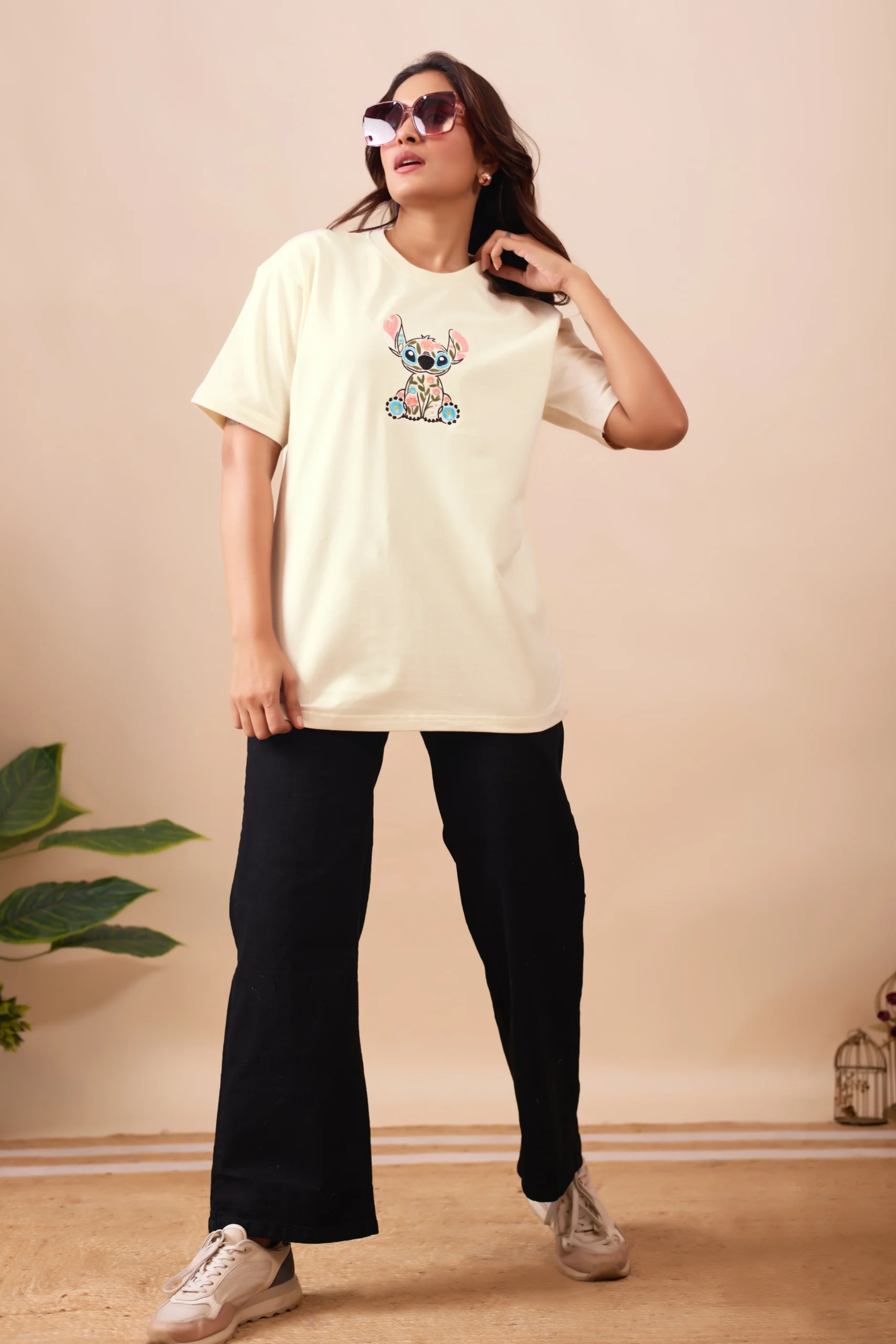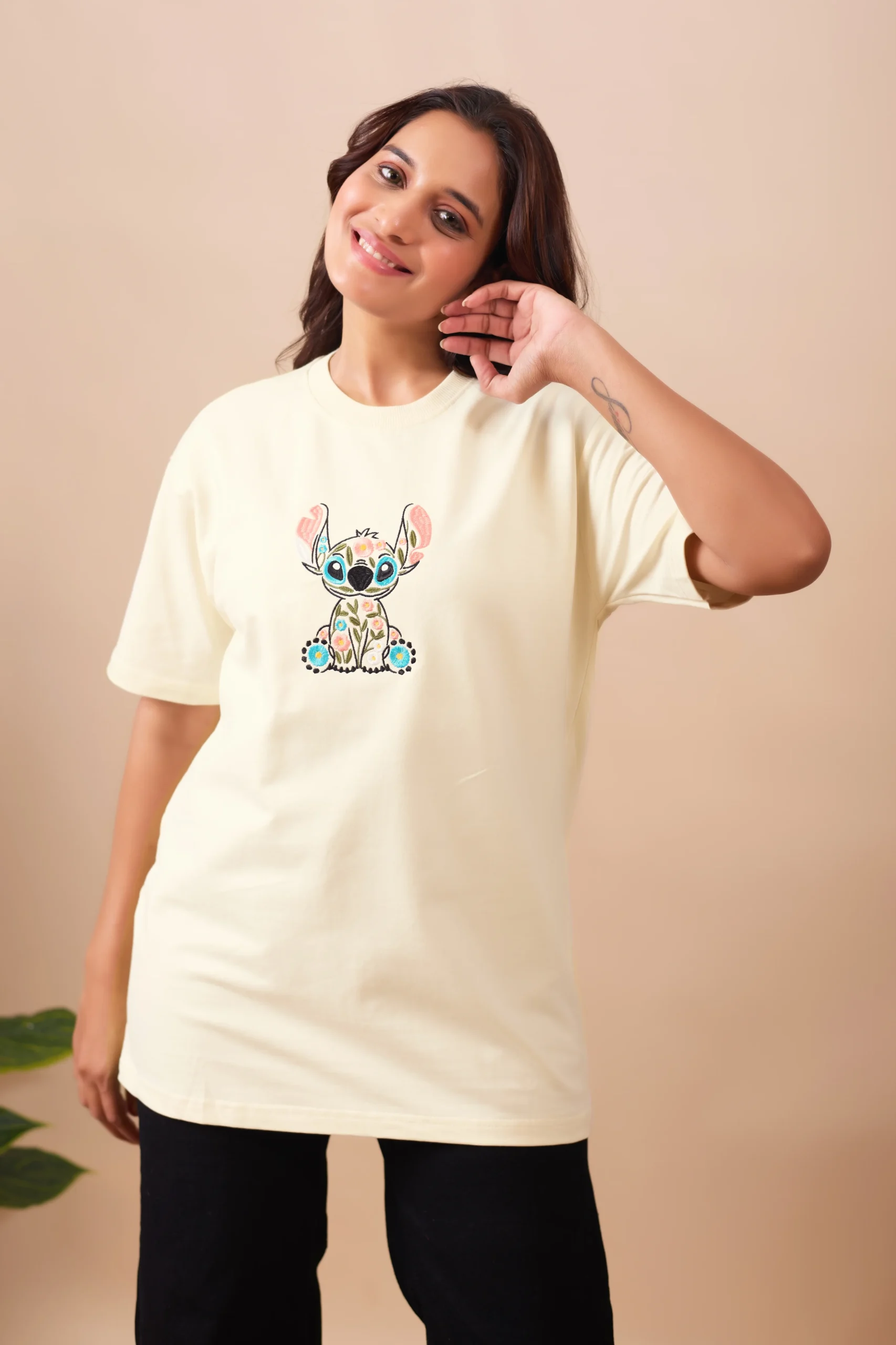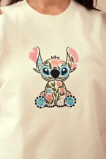 The Floral Stitch Oversized Tee blends comfort with creativity. Featuring a whimsical embroidered character filled with floral patterns, this tee brings a fresh and cheerful vibe to your wardrobe.
